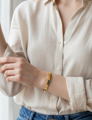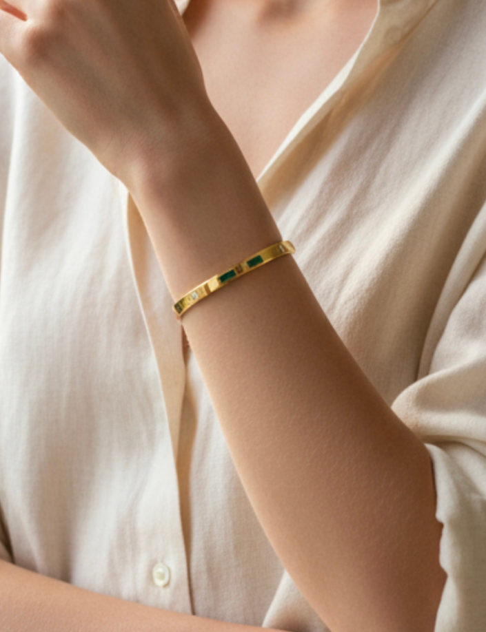 Elegant and timeless, this 18K gold-plated bracelet is beautifully adorned with a radiant Feroza (Turquoise) diamond, symbolizing luxury and sophistication. Designed to add a touch of grace to any outfit, its rich gold finish perfectly complements the vibrant blue stone, making it ideal for both everyday wear and special occasions. A refined statement piece that blends classic charm with modern elegance.