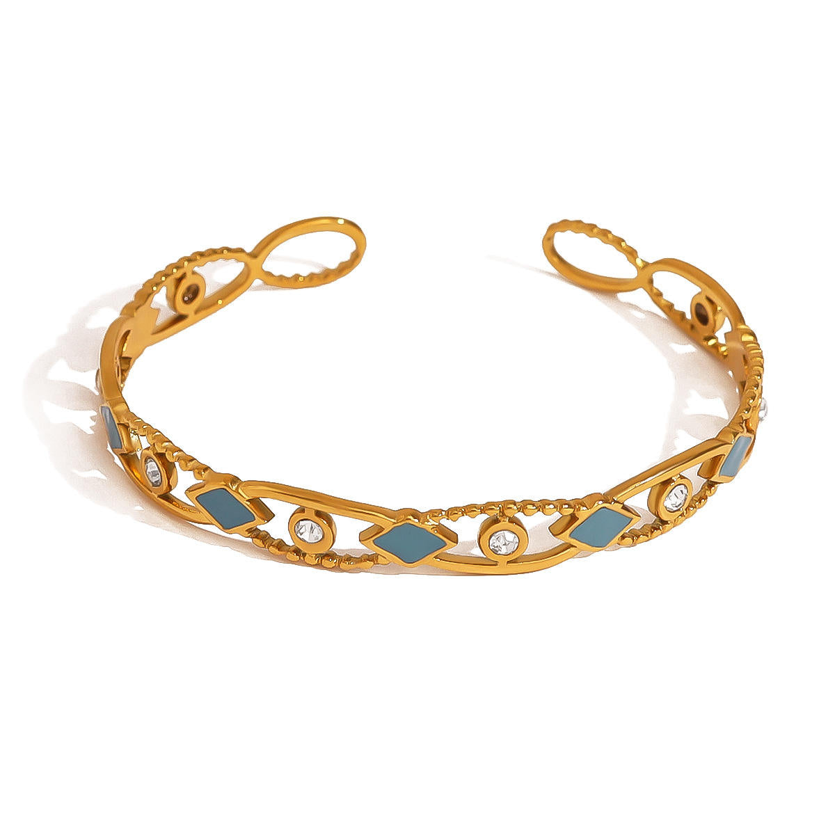 Add timeless sophistication to your look with this retro-inspired geometric cuff bracelet, expertly crafted from durable stainless steel and coated in rich 18K gold plating.